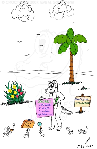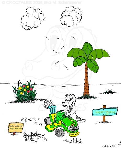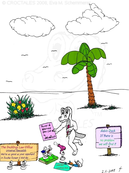 We're no crooks - we're about Croc - the alligator. Legal Eagle?? Yeah, you know ...those guys who always smart-quack... they are called advoducks or something like it... WARNING: This page is not suit- In case you didn't know: CROCTALES pictures are drawn by a (retired) attorney, so look for twisted words and double-meanings. Like they say, you can take the person out of the attorney but you can't take the attorney out of a person.... or something like it. The Ducklings Law Office: We're as good as your opponent in smoke screen & hot air
